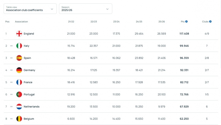 球队级别系数:取决于欧足联会员协会俱乐部系数排名、南美足联俱乐部排名等。例如,五大联赛系数为6,J联赛和K联赛系数为2。